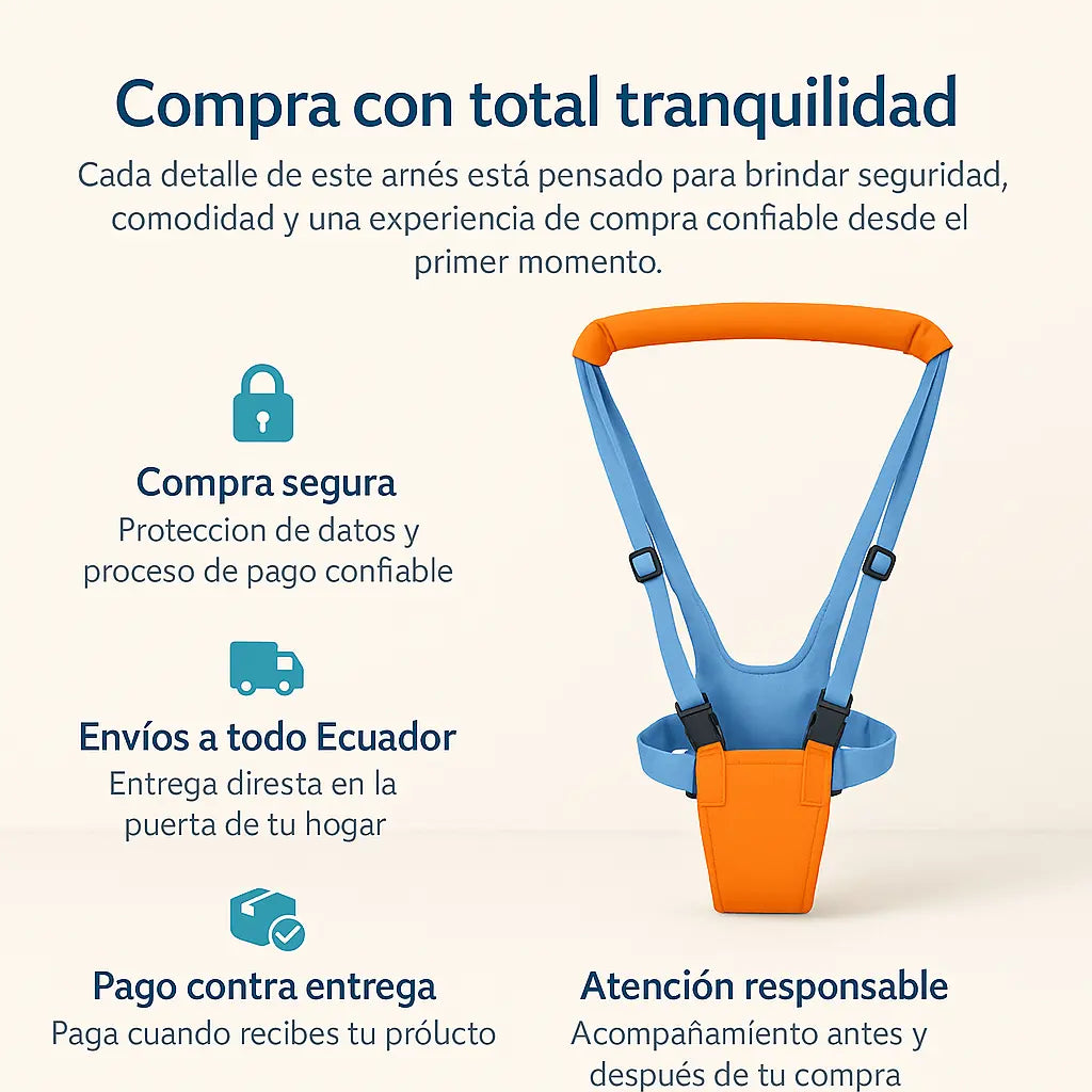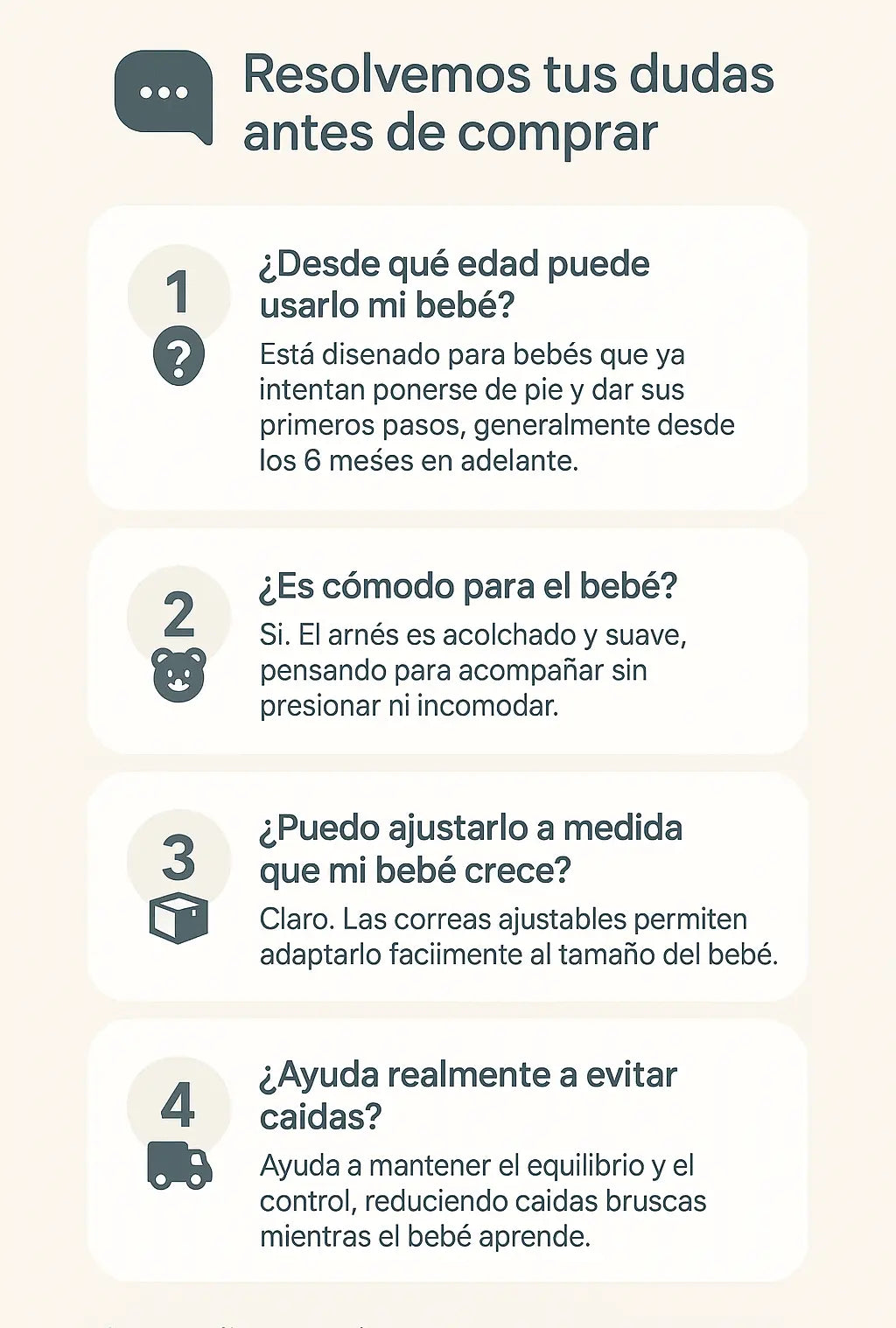 Mi bebé ya quería caminar y me daba miedo que se caiga. Con este arnés me siento más tranquila y él va feliz.